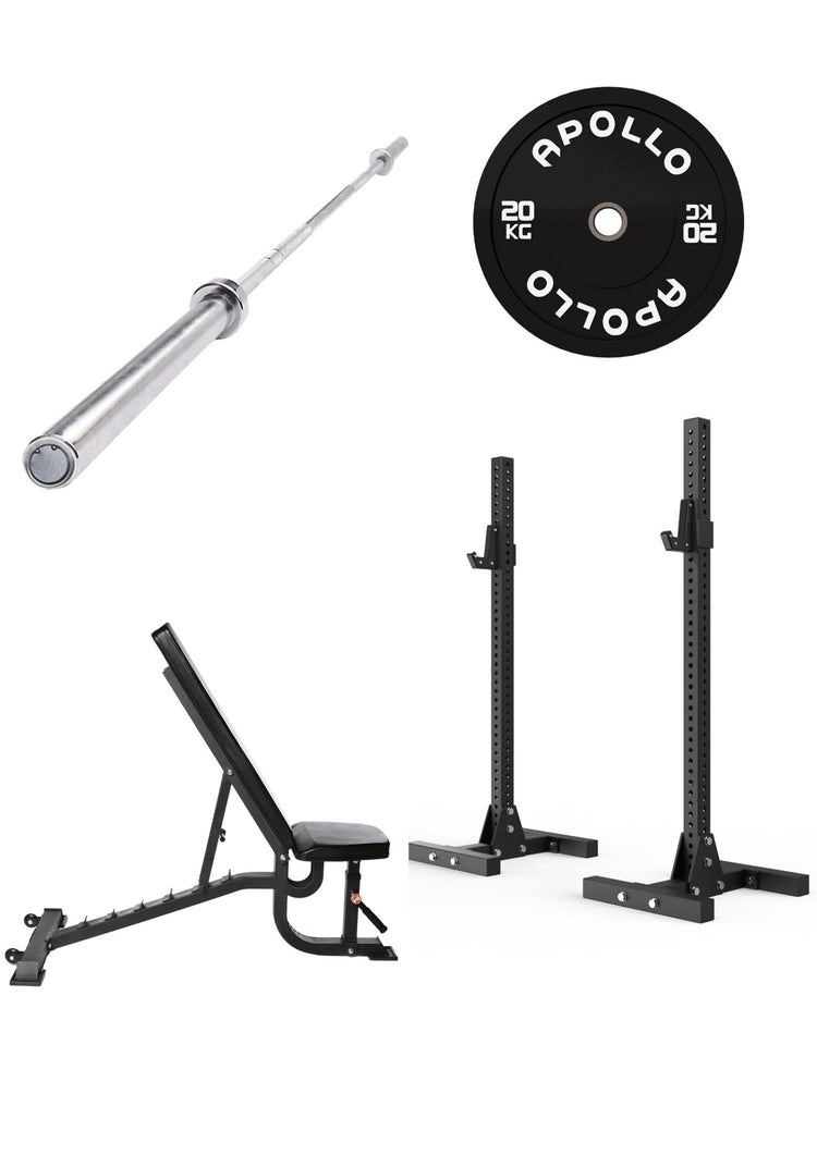 This Split Squat Stand Bundle consists of: Split Squat Stand, Mens Basic Bar 700lbs, 100KG Black Bumper Plate Set and Apollo Incline/Decline Bench.